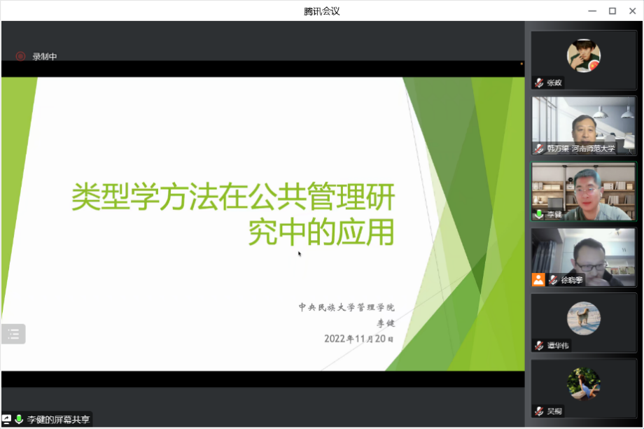 11月20日晚上,应政治与公共管理学院邀请,中央民族大学管理学院李健教授在“腾讯会议”上为学院师生作了题为《类型学方法在管理学研究中的应用》的学术报告。相关专业教师、研究生、本科生等二百余人参加。报告由学院副院长韩万渠主持。