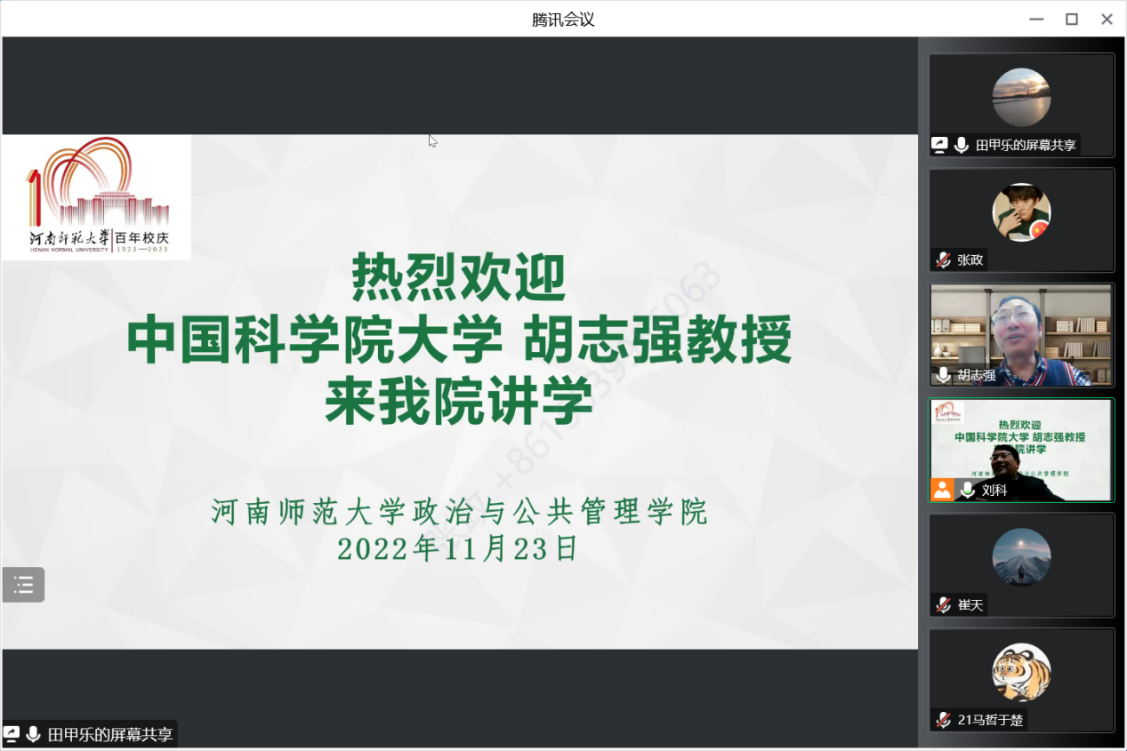 11月23日晚上,应政治与公共管理学院邀请,《自然辩证法通讯》主编、中国科学院大学人文学院胡志强教授在“腾讯会议”上为学院师生作了题为《改进我们的认知德性》的学术报告。相关专业教师、研究生、本科生等近百人参加。报告由学院刘科教授主持。
