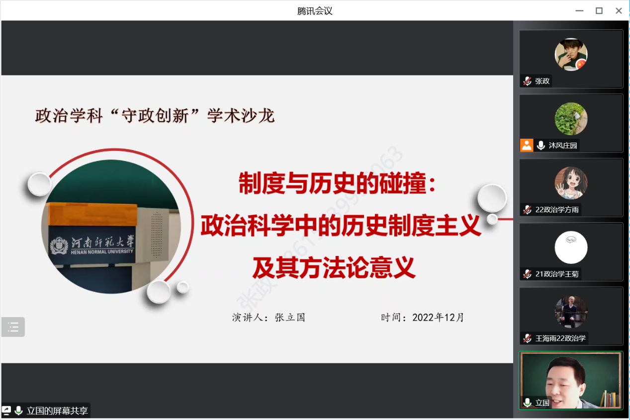 12月16日下午,政治与公共管理学院政治学重点学科第七期“守政创新”学术沙龙在线上举行,本期沙龙邀请学科成员张立国博士作了题为《历史与制度的碰撞:政治学中的历史制度主义理论及其方法论意义》的学术报告,学院相关专业教师、研究生、本科生等60余人参与。艾昆鹏副教授担任主持人。