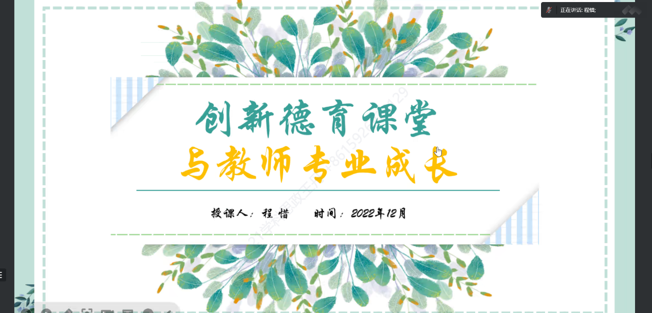 12月17日下午,政治与公共管理学院举办第八期思政名师大讲堂。本期邀请河南师大附中政治教师、中原名师魏巍思政工作室成员程惜在线上为学院师生作了题为《创新德育课堂与教师专业成长》的报告。学院相关专业教师、研究生等百余人参与。冯烨副教授担任主持人。