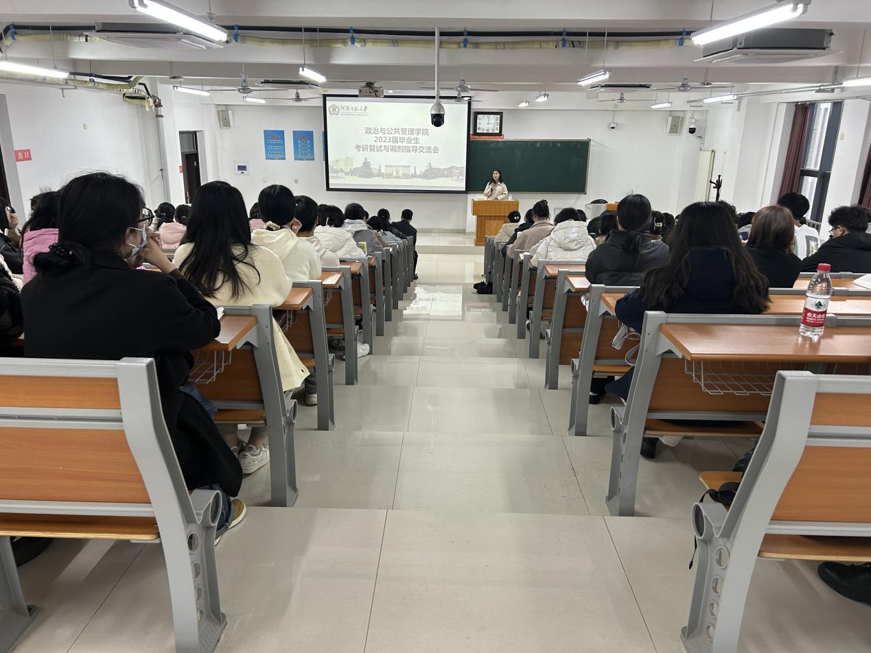 为帮助考研过线学生充分做好复试及调剂准备,3月16日下午,政治与公共管理学院于文昌楼509室召开2023届毕业生考研复试及调剂指导交流会,学院党委书记赵红杰,党委副书记张瑾,学院副院长韩万渠,2019级专、兼职辅导员及140余名学生参与其中,交流会由辅导员孙琳娜主持。