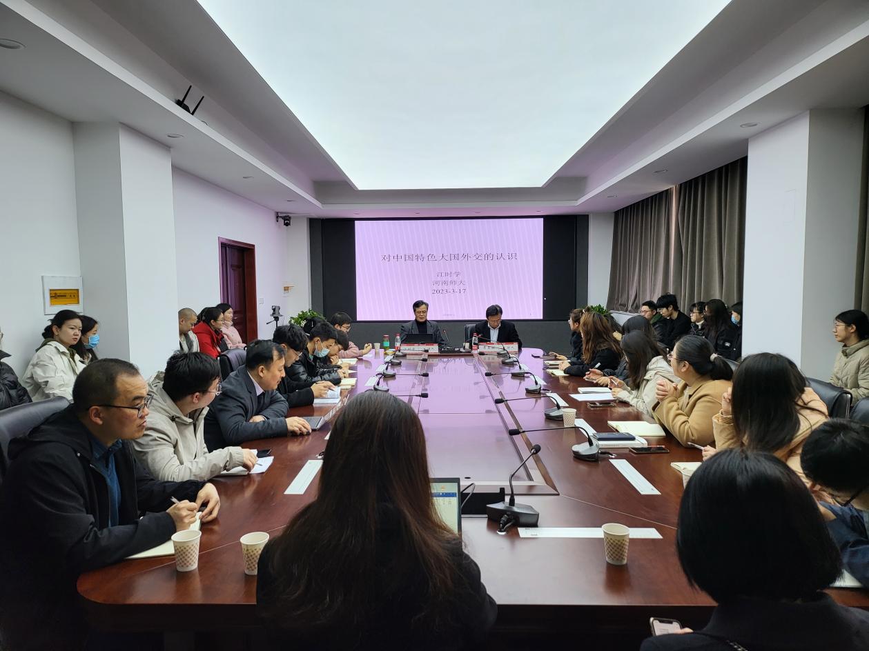 3月17日上午,政治与公共管理学院举办第九届世界和平与发展高端讲坛。应世界和平与发展研究院邀请,中国社会科学院研究员、上海大学特聘教授江时学为学院师生作了题为《对中国特色大国外交的认识》的学术报告。报告由研究院院长席来旺教授主持,学院部分教师,研究生,本科生参与。