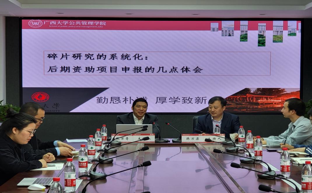 4月14日上午,应政治与公共管理学院邀请,广西大学公共管理学院副院长魏万青教授为学院师生作了题为《碎片研究的系统化:后期资助项目申报的几点体会》的报告。报告由学院副院长韩万渠教授主持,学院相关专业教师、研究生和本科生参与。