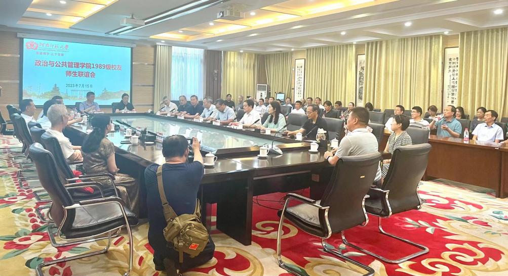 7月15日,政治与公共管理学院1989级近50名校友来校,与学院领导老师齐聚勤政楼第三会议室,举行1989级学生毕业三十周年师生联席会。发展与规划处处长、校友与基金工作办公室主任苏现伐,政治与公共管理学院党委书记赵红杰,院长李洪河,党委副书记张瑾,十余位教师代表出席联谊会。