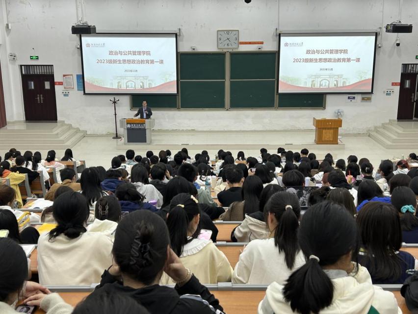 为深入学习贯彻习近平新时代中国特色社会主义思想和党的二十大精神,引导学生坚定理想信念,时刻坚守忠诚守信、敬业好学的道德品质,持续保持艰苦奋斗、永不懈怠的进取精神,政治与公共管理学院于11月3日下午在文昌楼开讲2023级新生思想政治教育第一课,学院党委书记赵红杰主讲,2023级全体新生参加。