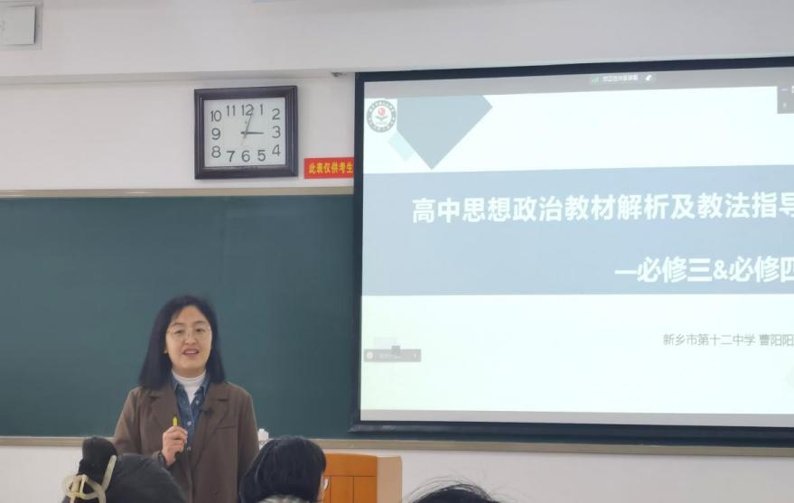 12月17日下午,政治与公共管理学院第二届思政名师大讲堂第九期在文昌楼213举行。本期讲堂邀请新乡市第十二中学政治组组长、河南省优质课一等奖获得者、河南省优质课优秀辅导教师曹阳阳作题为《高中思想政治教材解析及教法指导》的学术讲座。谢彩霞教授担任会议主持人,相关专业教师、学院师生线上线下积极参加。