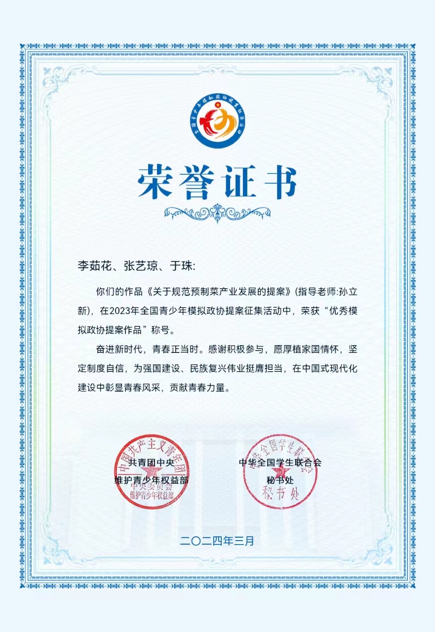 在团中央维护青少年权益部举办的2023年全国青少年模拟政协征集活动中,我院学生积极参与,2021级政治学与行政学专业学生李茹花、张艺琼、于珠的《关于规范预制菜产业的提案》荣获“优秀模拟政协提案作品”。