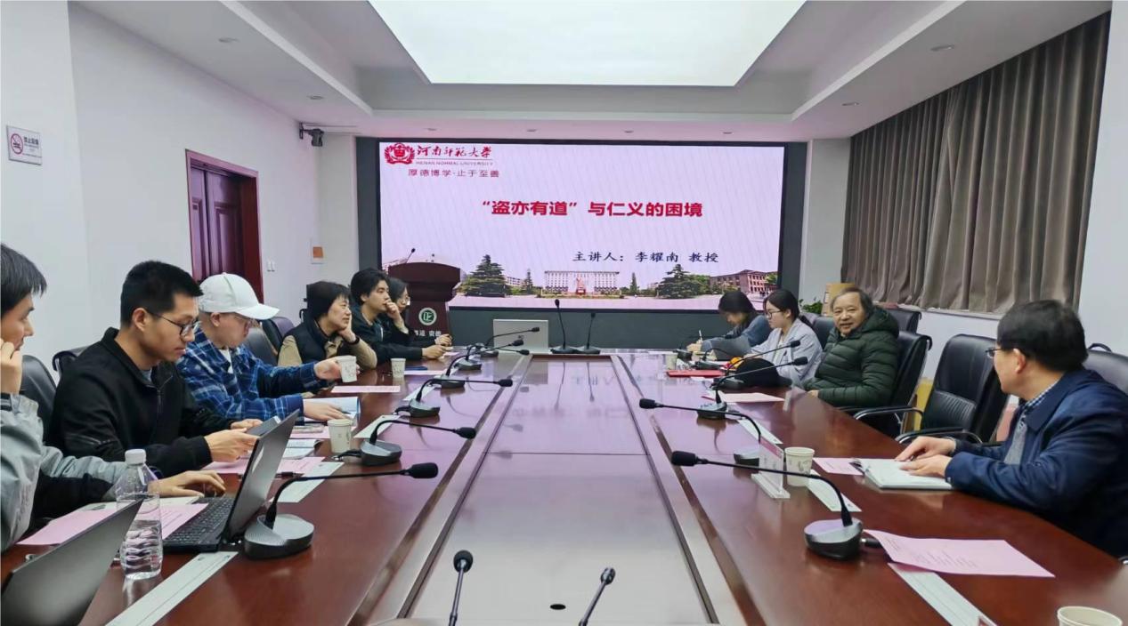 3月21日上午,政治与公共管理学院哲学学科第二十八期哲学沙龙在学院517会议室举行,本期沙龙邀请学院“银龄计划”特聘教授李耀南作了题为《“盗亦有道”与仁义的困境》的学术报告,学院相关专业教师、研究生、本科生参与。沙龙由校学报编辑部主任、哲学学科负责人刘科教授主持。