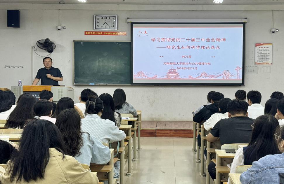 9月27日,政治与公共管理学院于求是西楼201室开展学习贯彻党的二十届三中全会精神集体学习活动。本次活动由学院党委宣传委员、副院长韩万渠担任主讲,全体研究生党员和2024级研究生参加集体学习。