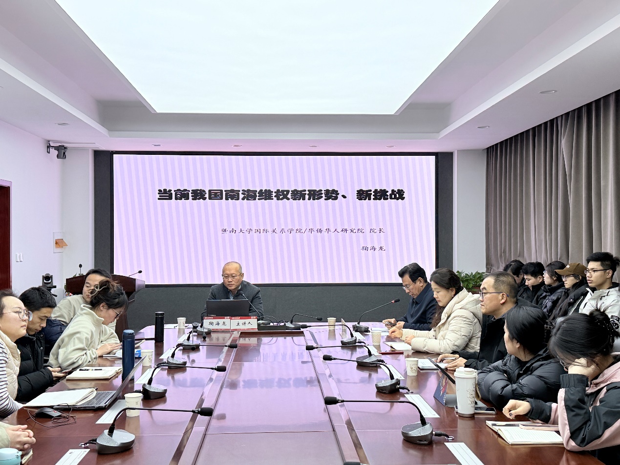 1214日晚上,应政治与公共管理学院邀请,暨南大学国际关系学院/华侨华人研究院院长鞠海龙教授在学院517会议室作了题为《当前南海维权的新形势、新挑战》的学术报告。学院相关专业教师和学生参与。讲座由世界和平与发展研究院院长席来旺教授主持。