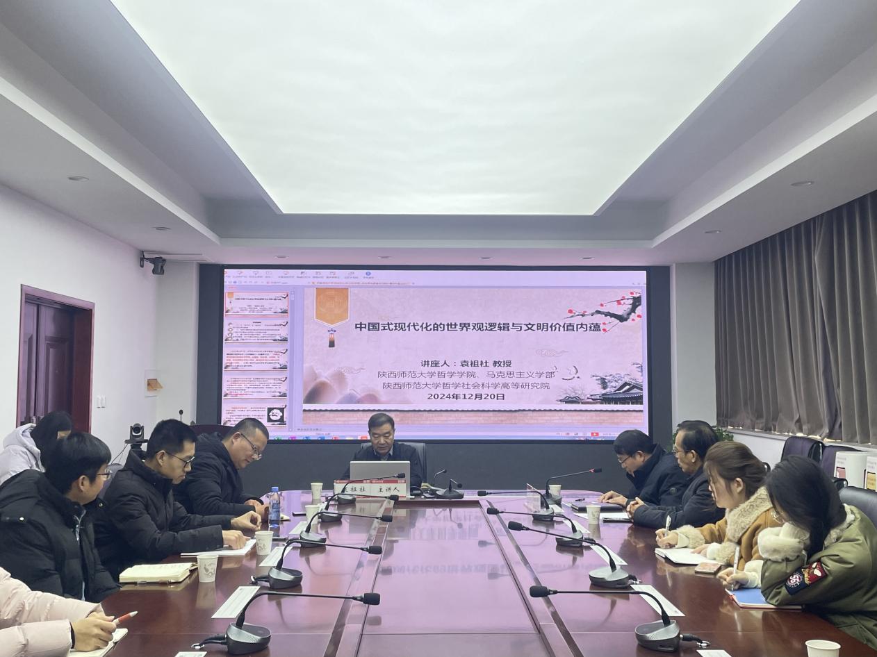 1220日上午,应政治与公共管理学院邀请,陕西师范大学哲学学院、马克思主义学部袁祖社教授在学院517会议室作了题为《中国式现代化的世界观逻辑与文明价值内蕴》的学术报告,学院相关专业教师、研究生和本科生积极参与,讲座由哲学学科负责人、校学报编辑部主任刘科教授主持。