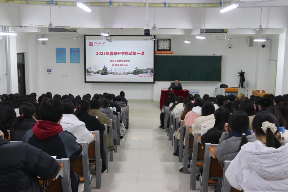 2月26日晚,政治与公共管理学院2025年春季开学思政“第一课”于文昌楼开讲。全体辅导员、学生党员、入党积极分子及主要学生干部近200人参加,学院党委书记赵红杰担任主讲。