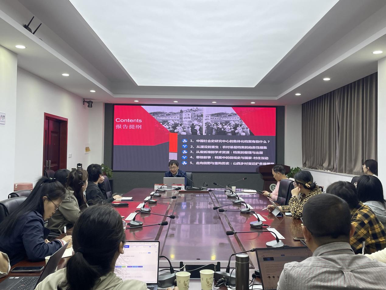 讲座甫始,马维强便以中心典藏的万余件集体化时期原始文献为切入点,重点剖析了基层财务账册与阶级成分登记簿这两类核心档案的学术价值。通过展示泛黄的会计凭证、社员工分簿等实物史料,马维强生动还原了人民公社时期农村社会的经济肌理与政治生态,为在场师生重构了集体化时期中国社会的立体图景。回溯山西大学中国社会史研究中心创建历程,马维强回顾了筚路蓝缕的文献采集岁月。从早期创始团队深入基层田野调查,到如今形成覆盖山西全境的史料网络,二十余载寒暑间,研究团队踏遍三晋百余县乡,抢救性收集散落民间的文书档案逾万件。这份执着不仅让“走向田野与社会”的学术理念落地生根,更产出了《集体化时代农村档案丛编》等标志性成果。