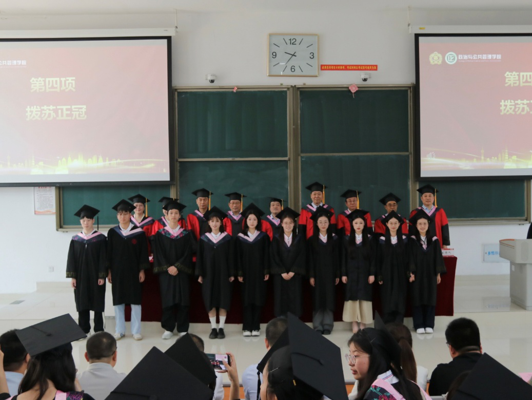 典礼在庄严的国歌中拉开帷幕。副院长佘德峰宣读《关于表彰2025年校级优秀本科毕业论文和优秀指导教师的决定》,领导老师为优秀本科生和优秀指导老师颁奖。副院长原晶晶宣读《政治与公共管理学院关于授予学位的决定》,与会领导为全体毕业生拨苏正冠。毕业生满怀感激之情,通过掌声与欢呼向领导老师们表达诚挚的感谢。