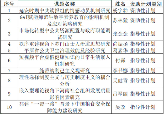 日前,经学校推荐、教育厅组织专家评审,2026年度河南省高校人文社会科学研究一般项目立项名单公示。我院共获批10项河南省高校人文社会科学研究一般项目,其中2项资助性计划,8项指导性计划。