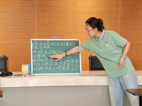促进团成员通过开设多元创新课程,为乡村学生打造知识与趣味兼具的学习体验。历史课上,团队成员师谱皓通过故事讲解、绘图演示等形式,生动讲解甲骨文的起源与特点,并选取“日”“月”“山”等象形文字,引导学生观察甲骨文与现代汉字的关联,同时他也鼓励学生积极临摹,让其在趣味互动中感受古老文字的魅力。语文课上,团队成员焦紫涵以“八十年前那场雨,洗出了今天蓝蓝的天”为切入点,结合经典抗战文学片段,引导学生感悟伟大的抗战精神,在文字与史实的交织中厚植家国情怀。思想政治课上,团队成员李韩雪用生动语言讲述国旗鲜红的底色里藏着的革命故事与国歌旋律中跃动的民族精神。课程结束后,促进团成员纷纷表示在支教过程中真真切切地感受到了教育工作者的责任担当,未来也将会运用自己所学知识去帮助更多学生树立正确的价值观,带领他们健康茁壮地成长,培养新时代社会主义建设者和接班人。