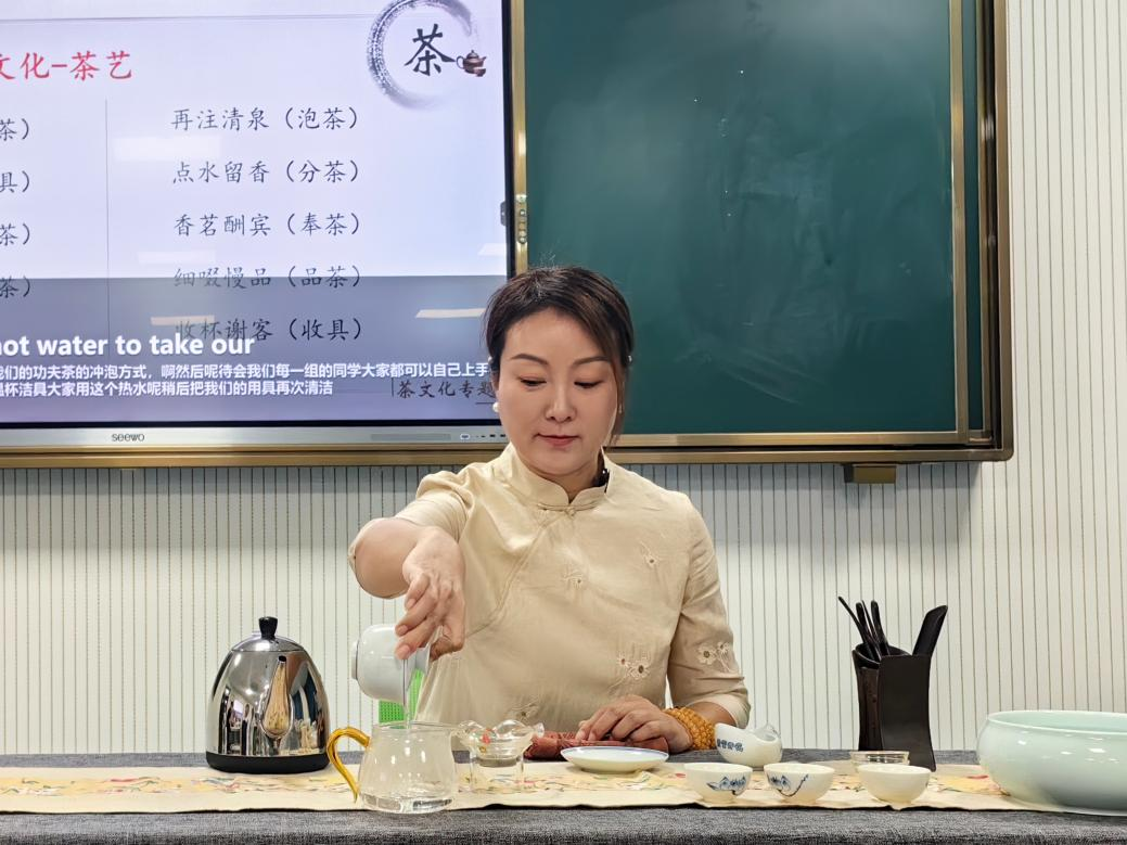 活动精心设计了三个互动环节。在文化讲述部分,王晶以《茶经》《茶录》等典籍为引,结合珍贵历史影像资料,系统讲解了中国茶文化的发展脉络、六大茶类特征及茶道哲学内涵。她特别指出,中国茶文化“和而不同”的理念与“一带一路”倡议的共商共建共享精神高度契合。茶艺展示环节,王老师娴熟演示功夫茶的制作过程,从“温杯烫盏”到“关公巡城”,每一个动作都诠释着“茶礼”的深厚底蕴。体验环节中,营员们分组体验了乌龙茶摇青、茉莉花茶窨制等传统工艺,在氤氲茶香中感受“一片叶子”的蜕变艺术。