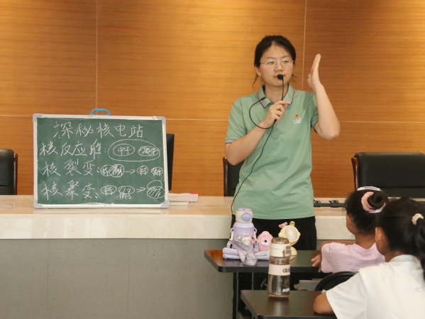 团队成员通过生动的历史讲述与互动教学,为社区学生带来一场兼具思想性与感染力的精神教育。5日下午,团队成员李涵讲授《“人造太阳”点亮能源梦想》这一章节课程。课程开篇以能源问题为切入点,通过对比分析传统能源的环境局限性与新能源的发展需求,引出核能这一重要能源形式。在讲解核聚变原理时,她采用生活化的类比方式,将抽象的物理概念具象化,帮助学生建立直观认知。此次课程巧妙地将人造太阳这一前沿科技概念与我国“两弹一星”的辉煌成就相联系,展现我国在核能领域从跟跑到并跑的历史跨越。6日下午,团队成员师谱皓带领学生了解“两弹一星”的科学内涵,激发其对科学的好奇心。此外,他通过讲述王淦昌隐姓埋名投身科研和郭永怀用生命守护数据的故事,让学生深刻感受科学家们的爱国精神和坚持不懈的品质。课堂互动环节,他将“两弹一星”精神的内涵创新融入到小游戏《听“两弹一星”精神》中,让学生在抢答的过程中深化对“两弹一星”精神的记忆,增强民族自信心与自豪感。7日下午,团队成员张亚婷以核聚变、核裂变和核反应堆为主讲内容,采用理论讲解与互动实践相结合的模式,通过设计核聚变和核裂变形成条件的数字卡片游戏等创新形式,让学生在参与中深化理解。这种寓教于乐的教学设计,既保证了知识传递的准确性,又增强了课堂的趣味性和参与度。