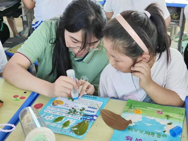 在精心布置的活动场地,实践队员刘铮引导孩子们手持放大镜,细致观察校园内收集的叶片脉络、花瓣结构。“哇!叶子的‘血管’在放大镜下跳舞呢!”“看!这片榆树叶边缘像锯齿,背面还有细细的绒毛!”四年级的王晓萌等同学的发现充满惊喜。课程伊始,队员们便强调了“尊重生命、取之有度”的理念,指导孩子们主要收集自然脱落的枝叶,或在确保不影响生长前提下谨慎采摘少量样本。