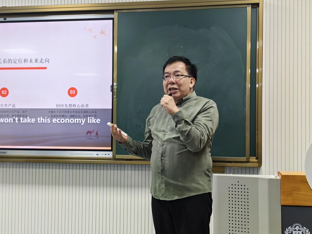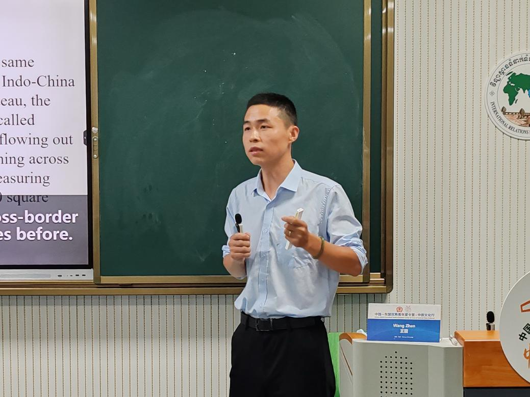 当日下午,学院教师王震作了“澜湄合作的成果、挑战及应对方法”专题讲座,他从语言文化切入,系统介绍澜湄次区域合作机制及“甘泉行动”“澜湄快线+”等合作项目。在讨论环节,中外营员围绕“大国竞争下的湄公河地区发展趋势”展开交流,一致认为应坚持相互尊重、合作共赢,推动区域和平发展。王震总结指出,大国应尊重各国平等权利,促进东南亚合作共赢。
