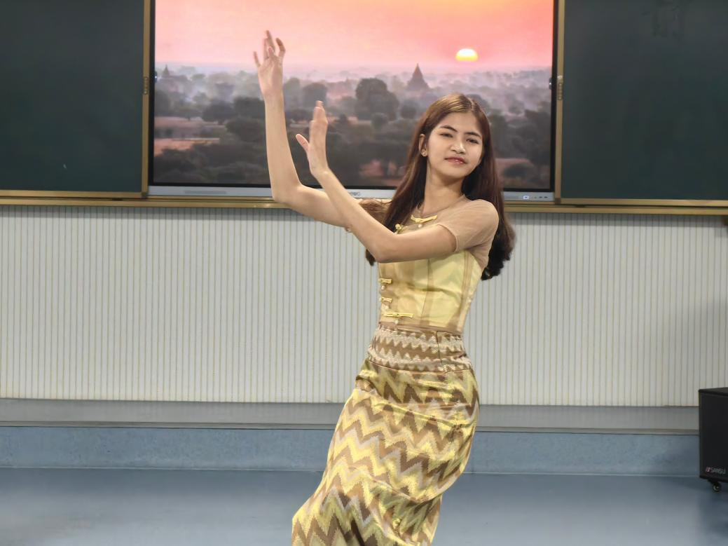 演出分为民族服饰时装秀、个人表演、中场游戏和集体表演四个环节。中方营员身着藏族、维吾尔族等民族服饰,外方营员则展示了柬埔寨、马来西亚等东南亚国家的传统服装,共同呈现出一幅文明交融的绚丽画卷。缅甸营员Zin Myat Myat Cho带来的传统舞蹈轻盈优雅,衣袖翻飞间尽显东南亚风情。在“击鼓传花”互动环节中,外方营员朗诵《悯农》感受中华文化魅力,中方营员则用泰语、越南语亲切问候,现场气氛热烈欢快。越南营员Tran Thi Minh Ha更向中国青年发出诚挚邀请,希望他们能亲身体验越南的风土人情。