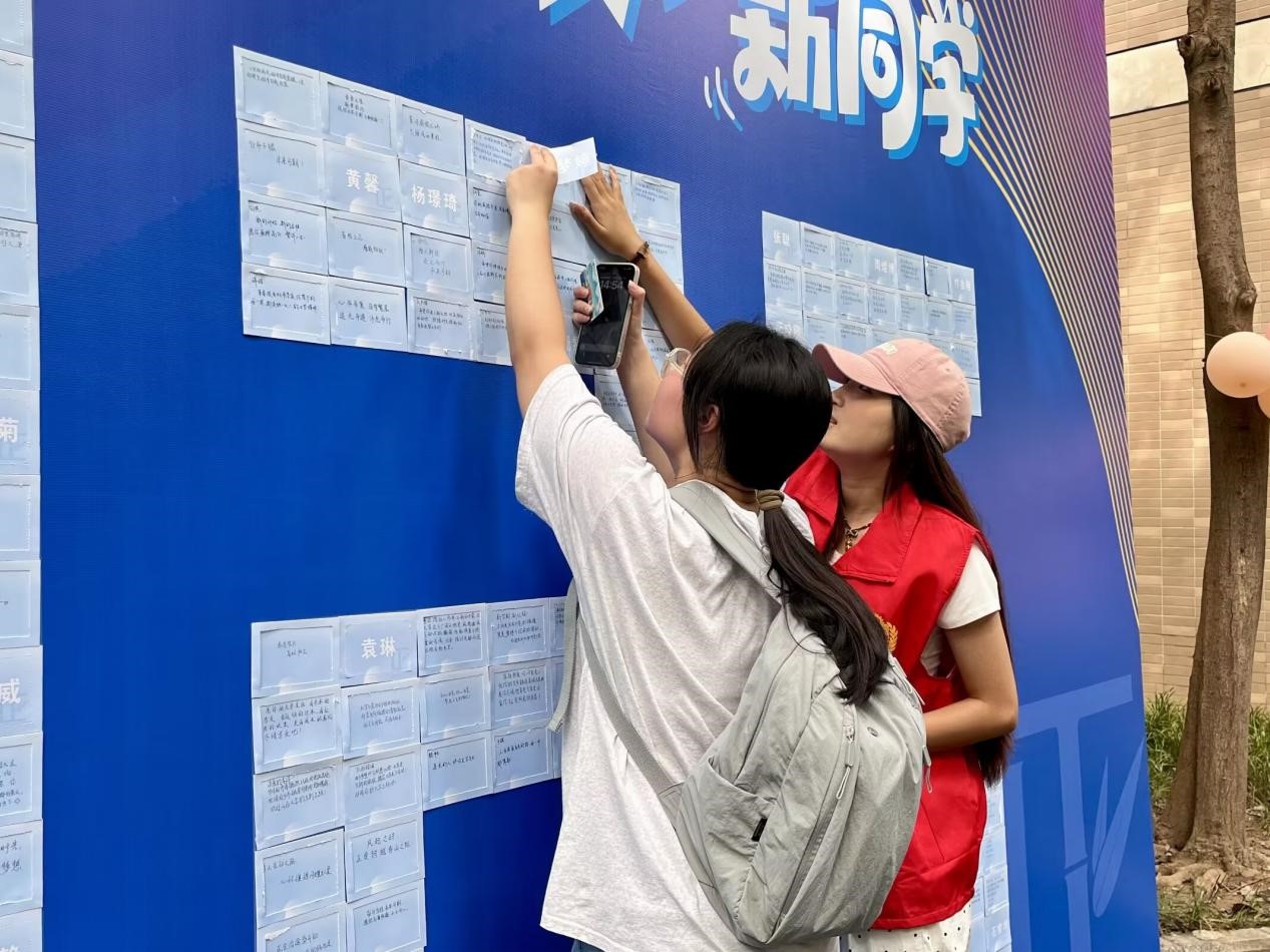 经过前期充分准备,迎新现场秩序井然。在新生入校环节,青春导航员提前与对接的新生取得联系,为他们提供路线指引和行李搬运等服务,随后协助新生前往迎新摊位完成入校签到,并带领新生参观图书馆、教学楼、餐厅等学习生活场所,助力其更快融入大学生活。在迎新报到点,学院特别设置了“相约未来——写给四年后的自己”主题活动。新生们从喷绘墙上取下印有自己姓名的专属明信片,在背面郑重写下对大学生涯的憧憬与规划,随后将明信片装入定制信封,交由学院统一珍藏。这些满载初心与梦想的信件,将在毕业之际送还他们手中,以充满仪式感的方式,为青春起点定格下难忘的瞬间。此外,志愿者与青春导航员还主动向新生介绍学院团委、学生会等学生组织和社会科学实验班的相关情况,并详细讲解高校助学贷款政策。报到现场还通过投影方式展示学院办学成果、师资力量与各类校园活动,全方位帮助新生深入了解学院。学院领导班子高度重视迎新工作,多次前往报到点与新生及家长交流,了解报到进展与新生需求,确保新生顺利入学。