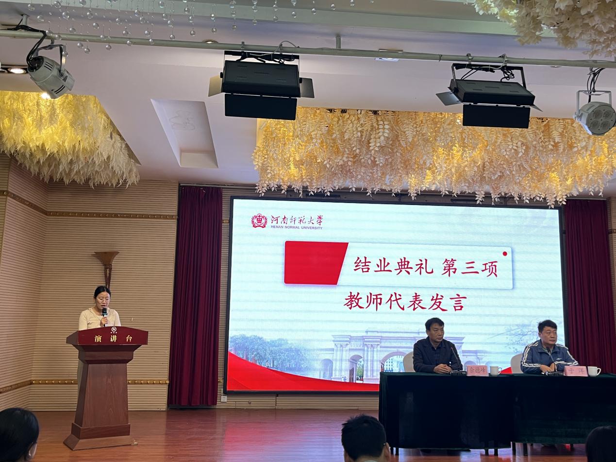 典礼在庄严的国歌声中正式开启。首先,佘德峰发表结业致辞,一方面对全体学员顺利结业表示热烈祝贺,并对授课专家和学院工作人员的付出表示感谢;另一方面,也对学员们表达了殷切期望。接着,班主任于洋对本次培训进行总结,并期望学员以此次培训为新的开端,将所学知识转化为提升课堂教学和育人实效的能力,在农村基础教育一线践行教育使命。最后,来自郑州市第一二四中学的学员代表王艳飞进行发言,她对学院搭建的学习平台和周到服务表示感谢,还分享了通过培训在教育理念和专业素养方面取得的显著收获。她承诺,返回工作岗位后,将以更加饱满的热情和更为专业的能力投身农村初中道德与法治教育工作,切实履行立德树人的根本任务。