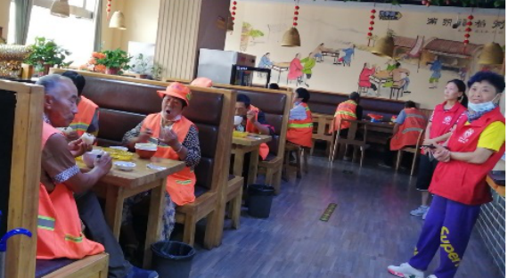 720日,王晓龙同学与“善客”公益团队一起来到爱心早餐志愿服务站点——濮阳县富民路福稻粥铺,面向当地环卫工人以及基层工作者群体,为他们送上“一份热气腾腾的早餐”。根据《濮阳善客爱心早餐志愿服务活动的工作流程》,王晓龙同学学习并为环卫工人表演了《感恩的心》的手势舞,向他们表达感激。随后,王晓龙同学随善客团队一起,为环卫工人提供取餐就餐服务。环卫工人宋师傅说到:“我们的工作比较特殊,每天五点起床,洗洗脸就赶忙打扫卫生,根本来不及吃早餐。对我们每个人来说,这不仅仅是一碗粥一个馍,更是一份温暖和关爱。希望更多人加入进来,用真心去温暖更多人!” 通过就餐时的聊天沟通,王晓龙及志愿者们了解了环卫工人们日常生活及工作背后的故事,更理解了他们的艰辛。环卫工人们风雨无阻,为城市的干净整洁默默奉献。简单平凡的他们,谱写了一支支动人的晨曲,却淹没在人海里悄无声息。