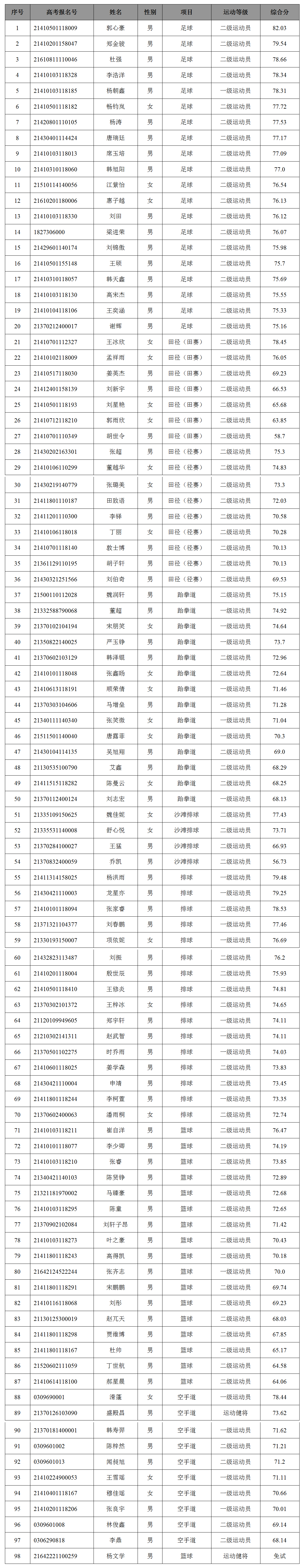 为贯彻运动训练专业招生考试公正、公平、公开的原则,根据国家体育总局办公厅、教育部办公厅《关于印发<2021年普通高等学校运动训练、武术与民族传统体育专业招生管理办法>的通知》(体科字[2020]169)要求,现将我校2021年运动训练专业单独招生录取原则及拟录取考生名单公示如下