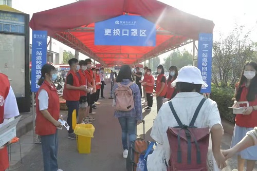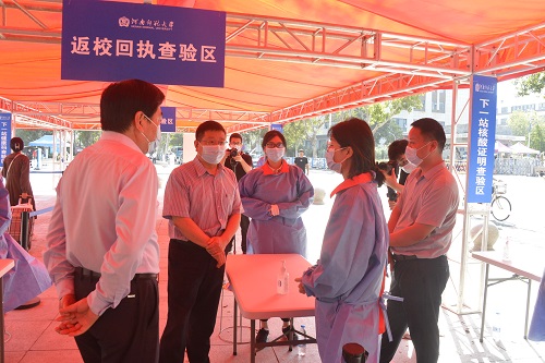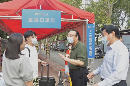 922日是学生返校的第一天,校党委书记赵国祥、校长常俊标、校党委副书记陈广文、副校长郭海明等学校领导到学生返校现场指导工作,慰问一线工作人员,并详细了解学生返校报到情况。校领导强调,要本着对师生生命安全高度负责的态度,严格按照返校流程和疫情防控总体要求,筑牢第一道安全防线;同时,嘱咐工作人员做好个人防护、保重身体。