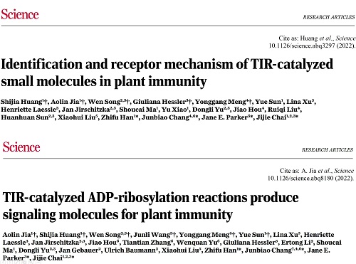 7月7日,Science杂志同期背靠背在线发表了来自我校有机功能分子与药物创新河南省重点实验室常俊标教授课题组与清华大学生命科学学院柴继杰教授课题组和马克斯-普朗克植物育种研究所Jane E. Parker教授合作的题为“Identification and receptor mechanism of TIR-catalyzed small molecules in plant immunity”和“TIR-catalyzed ADP-ribosylation reactions produce signaling molecules for plant immunity”的两篇研究论文。两项研究揭示了一类全新的核苷酸衍生物作为重要信号小分子在植物抗病过程中具有重要作用,并在作用机制研究方面取得重要突破。我校以共同通讯作者身份在《Science》上发表论文,标志着我校在该研究领域达到国际领先水平。