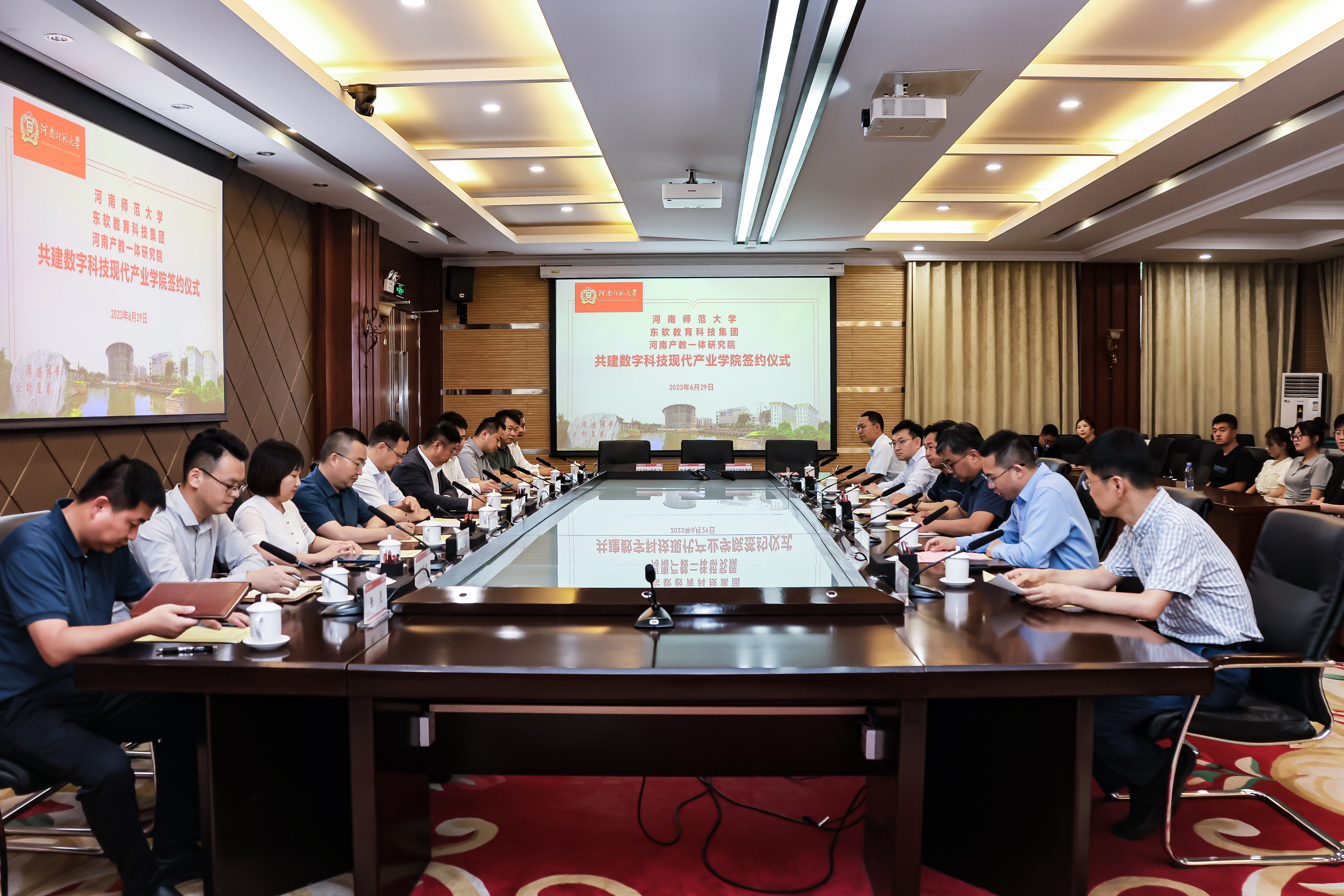 6月29日,我校在勤政楼第三会议室举行共建数字科技现代产业学院签约仪式。校党委常委、副校长刘玉芳,东软教育科技集团高级副总裁李印杲,河南投资集团人力资源部副主任、人力共享中心主任、河南人才集团党委委员、副总经理王利军出席。仪式由党政办公室副主任任富同主持。东软教育科技集团、河南产教一体研究院、党政办公室、发展规划处、教务处、软件学院等部门负责人参加签约仪式。