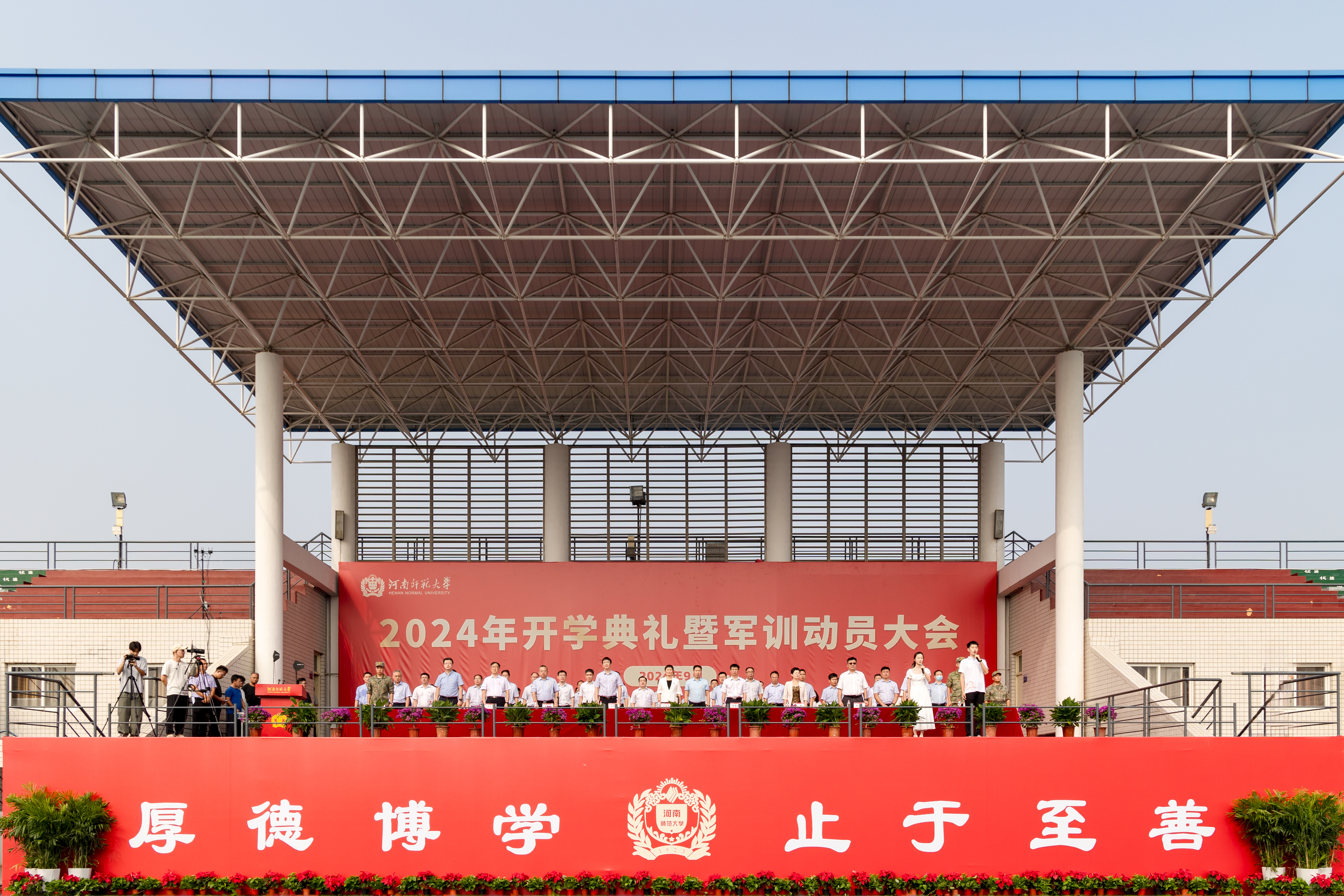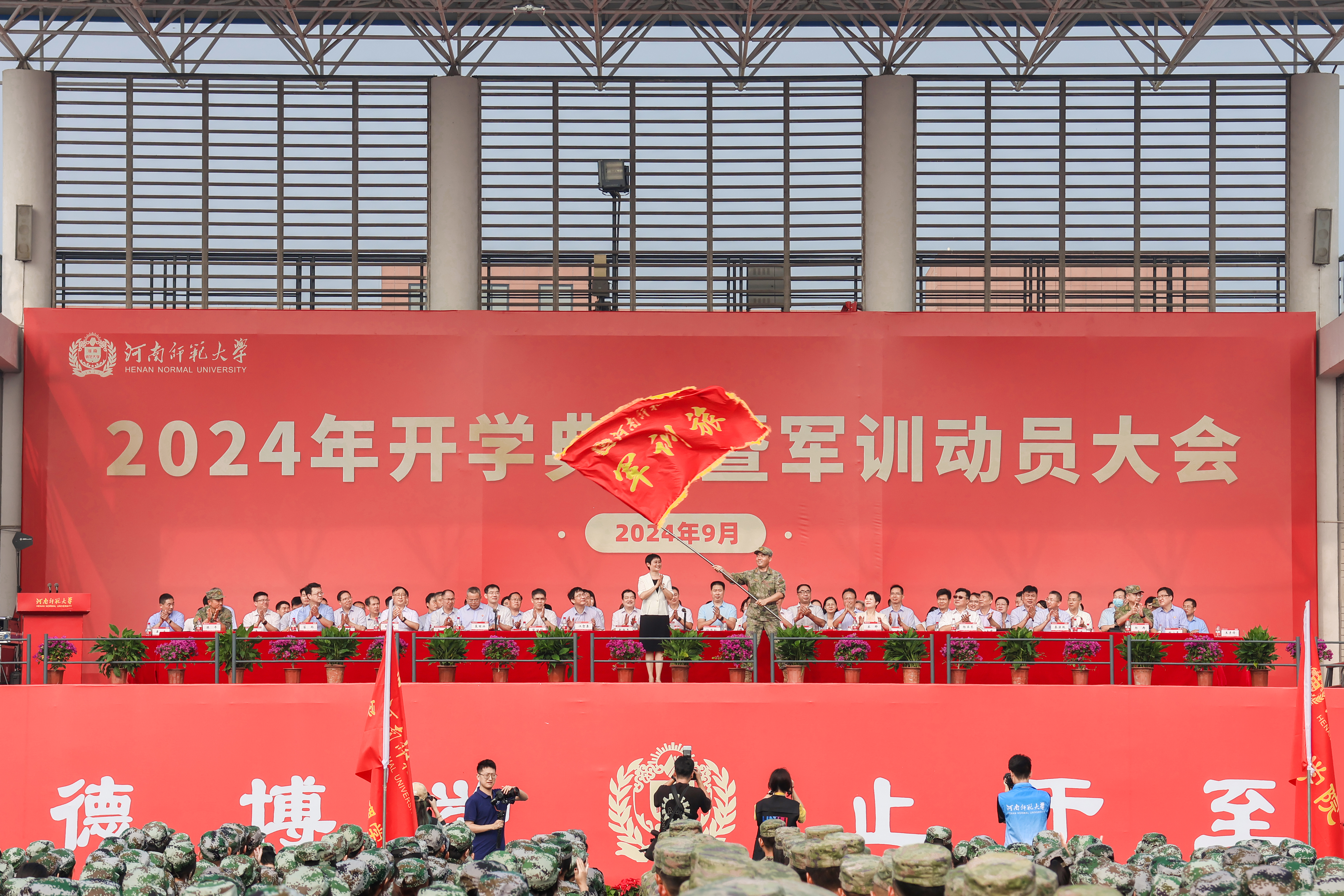 9月9日上午,我校2024年开学典礼暨军训动员大会在西校区田径场隆重举行,校领导冯淑霞、张尚字、江智勇、宋晔、杨亚东、王玉良、秦法跃、苗雨出席。新乡市牧野区人民武装部上校部长郝冉,军训帮训部队、中国人民解放军32150部队中校副参谋长陈平,中国人民解放军32150部队全体帮训教官,教师代表卢欣教授、迎新工作和军训工作领导小组成员、各院(部)负责人、新生辅导员和2024级全体新生共同观礼。典礼暨军训动员大会由校党委常委、副校长聂国兴主持。