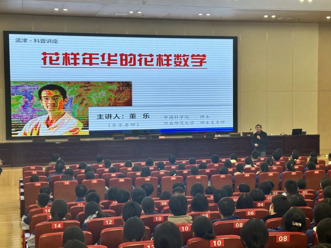 高层次人才工作办公室主任、人力资源部副部长董乐面向孟津一高师生作科普讲座《花样年华的花样数学》。他通过介绍数学在密码、建筑设计、天气预报等日常生活领域中的应用场景,激发学生对数学学习的兴趣。他强调,数学不仅仅是数字和公式的堆砌,更是探索世界、解决问题的有力工具。他勉励同学们用数学的眼光去观察世界、用数学的思维去思考问题,珍惜时光,努力学习,为未来发展打牢基础,并欢迎对数学有浓厚兴趣的同学报考相关专业,共探数学之美。