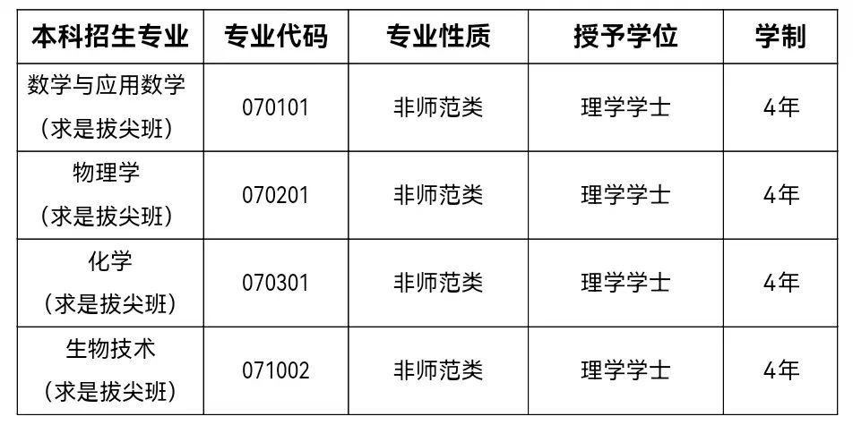 俊甫书院求是拔尖班2025级开设数学与应用数学、物理学、化学、生物技术四个专业(非师范类)方向,每个专业方向招收30人。
