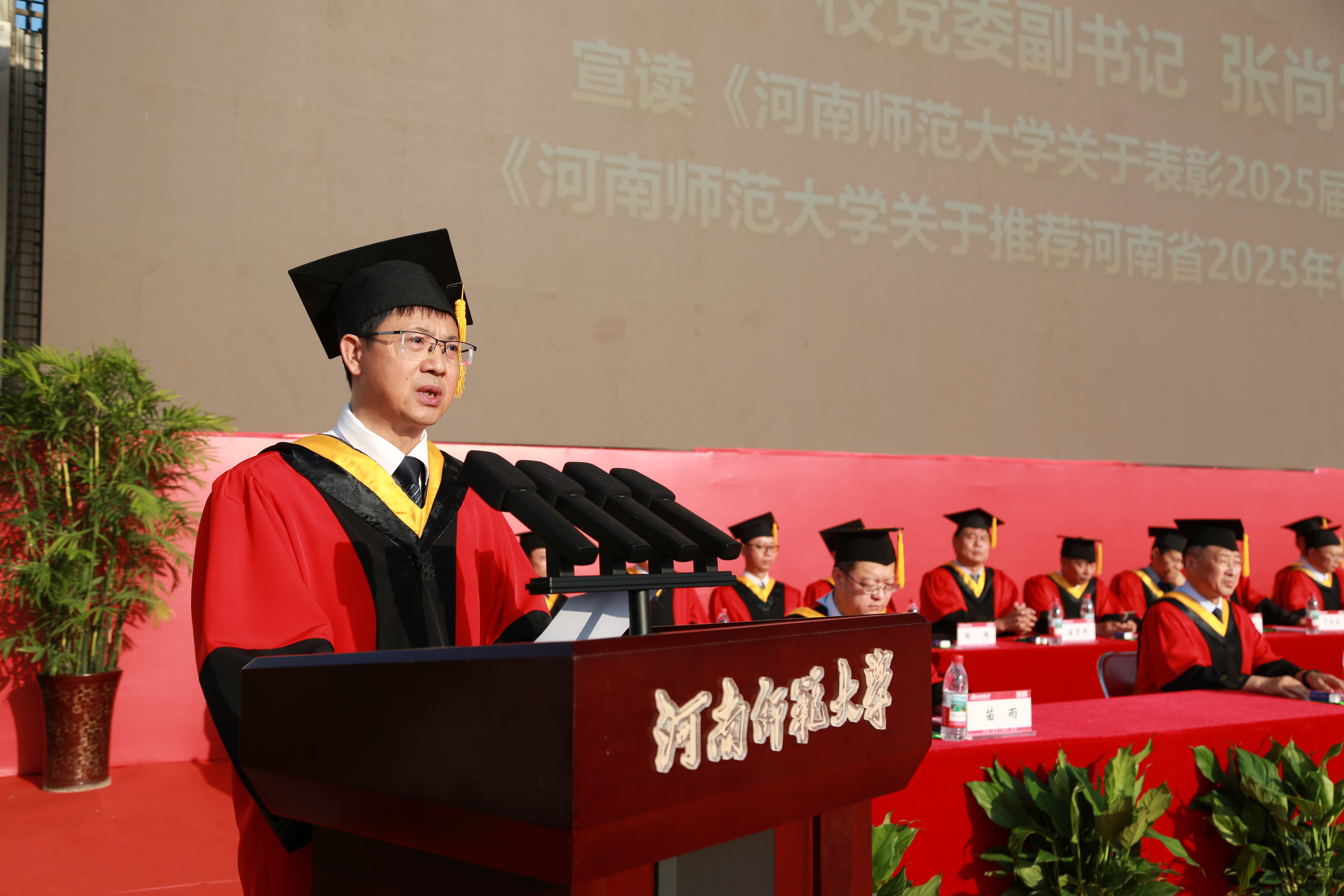 伴随着雄壮的国歌声,毕业典礼暨学位授予仪式正式拉开序幕。校党委常委、副校长苗雨教授宣读学位评定委员会学位授予决定,副校长宋晔教授宣读学位评定委员会荣誉学士学位授予决定。校党委副书记张尚字宣读《伟德官网下载苹果版关于表彰2025届优秀毕业生的决定》和《伟德官网下载苹果版关于推荐河南省2025年优秀应届毕业生的决定》。