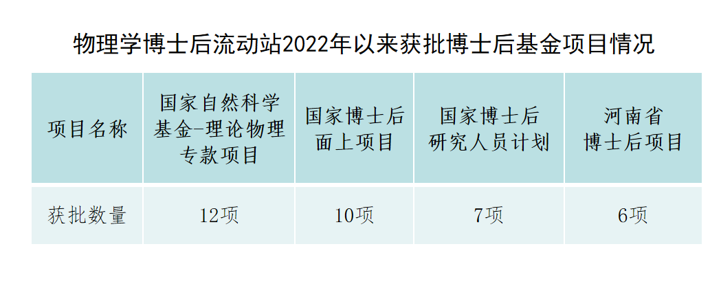 物理学博士后流动站累计招收博士后研究人员70名,先后4次参加创新创业大赛,获得2021年全国博士后创新创业大赛河南赛区优秀创新项目并入围第一届全国博士后创新创业大赛创新赛总决赛。2022年以来获批国家自然科学基金-理论物理专款项目12项、国家博士后面上项目10项、国家博士后研究人员计划7项、河南省博士后项目6项;累计发表SCI源期刊期刊论文228篇。
