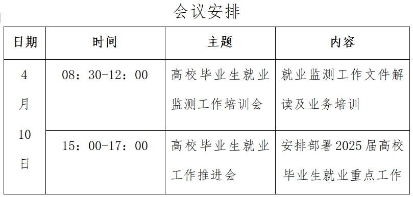 为落实2025届全国普通高校毕业生就业创业工作会议和2025年全国高校毕业生等青年就业创业工作视频会议部署,切实做好2025 届毕业生就业创业工作,进一步提升就业工作战线人员业务综合能力,促进就业监测工作顺利开展,河南省教育厅定于4月10日召开会议,现将我校有关参会事项通知如下: