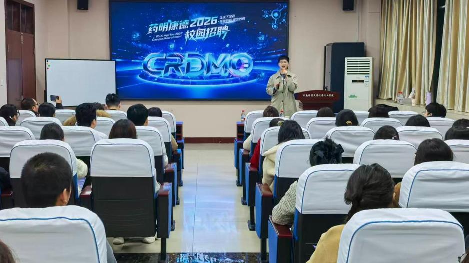 宣讲会上,药明康德子公司合全药业工艺研发部执行主任、校友李忠波首先系统介绍了企业发展历程与全球布局。作为覆盖“CRDMO”全产业链的行业标杆,药明康德在化学药研发、生物药测试、细胞基因疗法等领域的核心优势引发学生广泛关注。针对我院专业特色,其重点解读了有机合成研究员、分析测试工程师、制剂研发助理等热招岗位的能力需求,专业覆盖有机化学、药物化学、分析化学等多个领域。合全药业工艺研发部副主任戚庆标对学院毕业生给予了高度认可,通过视频全面展示了合全药业的业务方向、办公环境、生产车间、岗位要求及薪资待遇。合全药业人力资源高级专员吴宇清就参会毕业生提出的问题给予了细致解答。
