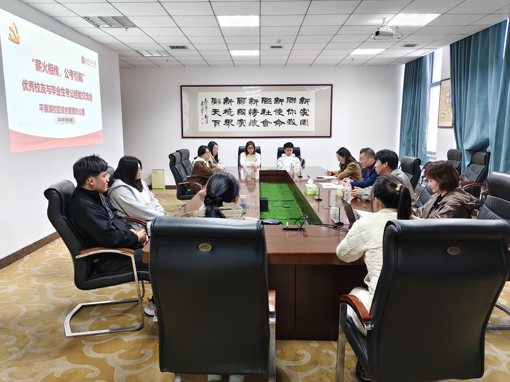 10月30日下午,平原湖校区综合管理办公室在校区第一会议室举办以“薪火相传,公考引航”为主题的毕业生考公经验交流会。特邀原新联学院2022届校友武世鹏与2026届毕业生进行面对面交流,分享考公经验。平原湖校区综管办相关师生参加活动。