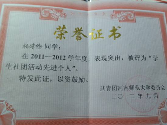 2、我社成员王慧萍、杨哲被社团推优。周元、苏江艳、杨建彬被评为社团先进个人。