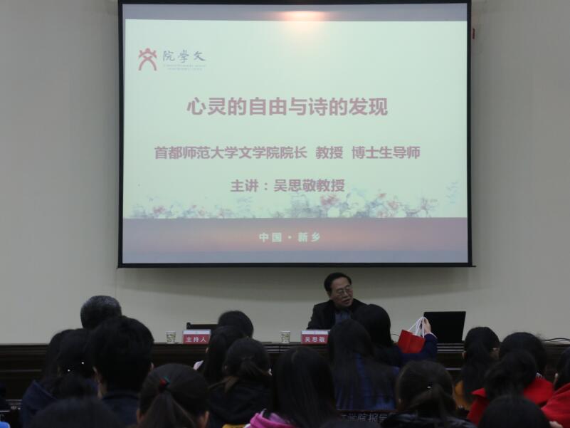 10月27日晚,首都师范大学文学院院长、博士生导师吴思敬教授在文学院报告厅作了题为“心灵的自由与诗的发现”的讲座。文学院相关专业教师、本科生等共百余人聆听了讲座。讲座由文学院副院长赵黎波主持。