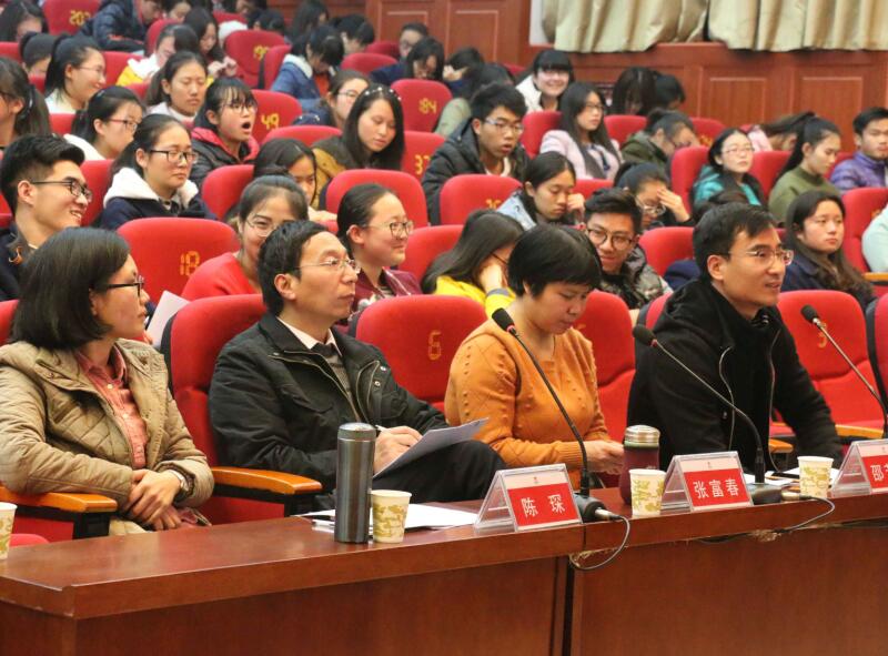 11月14日晚,文学院在东教B302举办了第四期“阅享经典”读书与影视分享交流会。文学院党委副书记高飞,文学院团委书记、2016级辅导员王秀杰,各年级专、兼职辅导员与文学院近三百名同学共同参加了此次活动。外国文学调研室邵芳菲,现当代文学调研室周惠,古代文学调研室张富春及戏剧影视文学教研室陈琛四位老师担任本次分享会评委。
