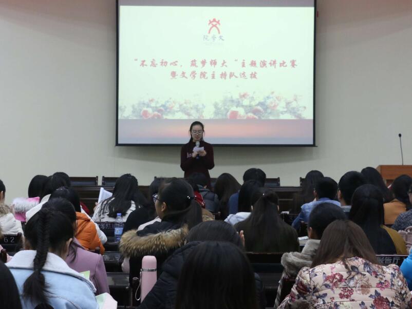 为响应我校“学在师大,心系国家”学风建设年活动的号召。12月6日晚,在文学院团委书记、2016级辅导员王秀杰的组织带领下,文学院在报告厅举办了“不忘初心,筑梦师大”主题演讲比赛暨主持队选拔活动。比赛邀请了六位具有丰富演讲和主持经验的学生作为评委。来自不同专业的近七十名学生积极参与其中。