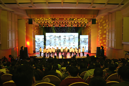 为了多角度、全方位地展现经典魅力,颁奖典礼精心设计了精彩纷呈的文化汇演。清新雅致的舞蹈《雨巷》让大家一开场就体验到了中华文化的韵味与悠长。情景剧《红高粱》演员融合说唱,以第三人称视角向大家讲诉了九儿带领队伍与敌人同归于尽,用自己的生命在山东高密大地上谱写了爱与征服,野心和意志的传奇故事,淋漓尽致地展现了华夏子孙充满血性的民族精神。《永远的丰碑》讲述了长征途中一位军需处长把棉衣让给小战士,自己却不幸失去生命,化成一座永恒精神丰碑的故事。百折不挠、甘于奉献的长征精神给观众带来心灵的震撼。舞蹈《汉画》中,现场观众跟随身穿汉服女子的曼妙舞姿一睹汉文化兼容并包、含蓄隽永的风采。组诗朗诵《诗萃中华》,同学们别出心裁,将富有历史气息的舞台剧与千年传诵的诗歌结合起来,时空穿梭中重现了《蒹葭》爱慕与惆怅、《将进酒》慷慨与激昂的场景;文学院团委学生会成员带来的群诵《沁园春?雪》在伟人“数风流人物,还看今朝”的万丈豪情中,营造了激昂、奋进的文化氛围,表现出师大学子朝气蓬勃、砥砺前行的坚定信念。颁奖典在气势磅礴的《共筑中国梦》中落幕。