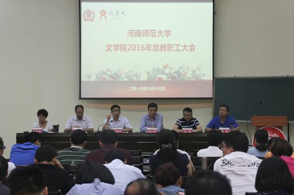 6月13日下午,文学院2016年度教职工代表大会在学院报告厅召开。文学院党委书记王俊杰,院长李永贤,副院长段勃、赵黎波、陈鹏出席会议。文学院全体教职工参加了此次大会,会议由文学院党委副书记、工会主席高飞主持。