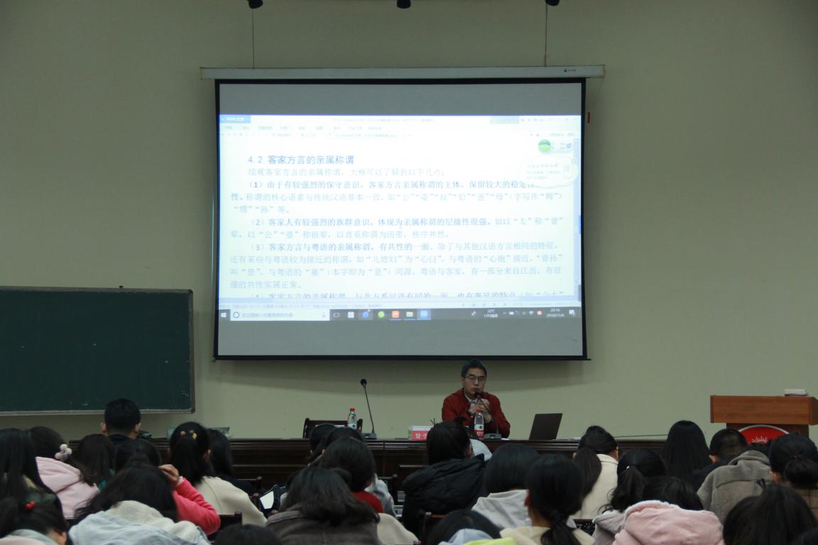 首先,会议由孙志波老师向大家介绍了甘于恩教授在南方语言学研究和方言学保护方面的成就,表达了对甘于恩教授亲临我校文学院进行讲授的感谢。讲座伊始,甘于恩教授从现代方言学的研究意义入手,以专业性的眼光洞悉了方言研究的必要性。为使同学们更加清楚地理解南方方言的独特性,甘于恩教授将《方言和亲属称谓》学术报告分为五大类多角度阐述。对亲属称谓的研究意义的阐释和对汉语言亲属称谓的基本特点的讲述,使在座同学对于不同方言的特殊性有了大致的感受,充分调动了同学们对南方方言的兴趣。对广东三大方言亲属称谓的同与异的生动讲述,让同学们争相模仿发音,讲座充满了欢声笑语。讲座接近末尾,甘于恩教授再一次分析方言学研究与保护的现代意义——对于地区特色文化的保护和加强各民族文化交流具有深远影响。讲座结束,甘于恩教授对于同学们的问题做了耐心细致的解答,并赠予部分同学们关于方言学的书籍,希望同学们在今后的方言学习中进行更加有价值的探索。