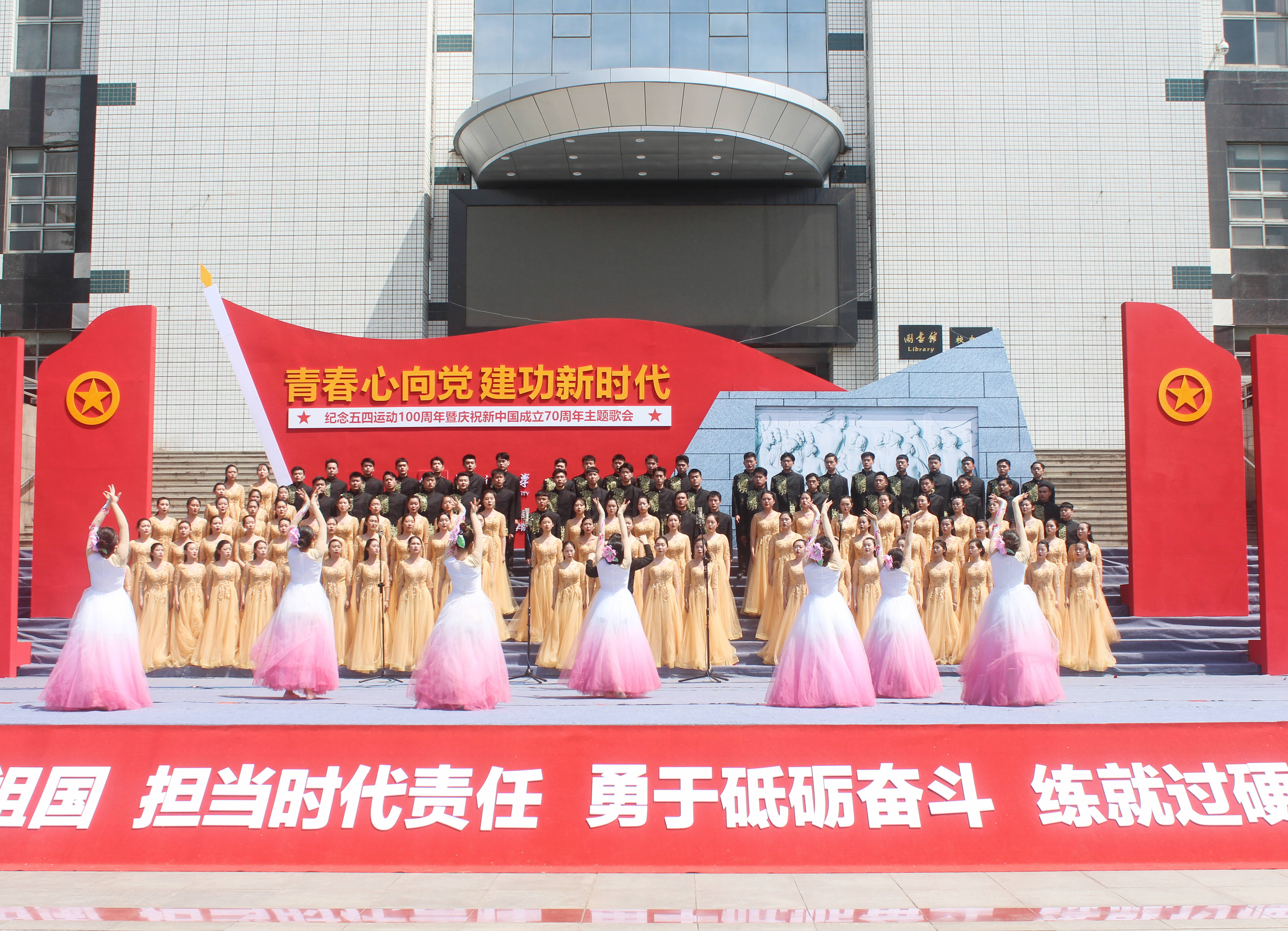 5月11日上午,我校“青春心向党·共建新时代”五四主题歌会在西区图书馆前广场举行。在全体同学共同努力下,文学院最终获得团体一等奖及最佳形象奖的优秀成绩。同时,作为合唱伴奏和指挥,音乐舞蹈学院学生庞博淇、窦春蕾分别揽获最佳钢琴伴奏奖与最佳指挥奖。
