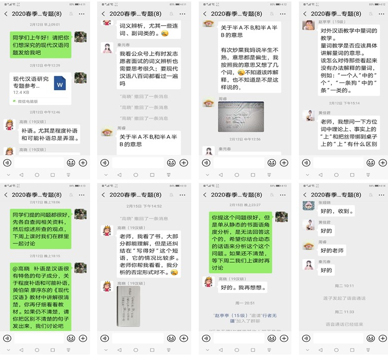 鉴于周一系里教学群中授课老师分享的教学感言,担心在“学习通”和“雨课堂”平台在线上课不够畅通,自己解决不好,所以决定“现代汉语研究专题”用微信这一平台电话直播上课。根据群里学生提的问题,我这次课讲的是第一个学生提出的问题——关于汉语的补语问题,整个教学过程是通过微信电话直播与学生在互动中进行的。这次课不仅分析、解决了同学们提出的有关补语的各种问题,还留下了所涉及的其它语言问题,让同学们课下思考。觉得这次教学效果非常好。