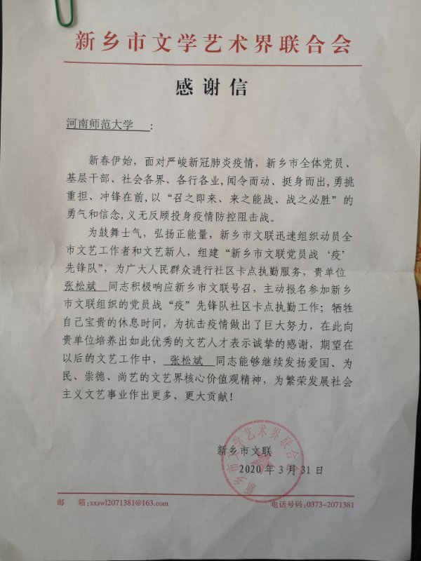 近日,我校收到来自新乡市文学艺术界联合会的感谢信,信中对我院的张松滨同志主动参加新乡市文联党员战“疫”先锋队并积极参与疫情防控工作提出表扬。